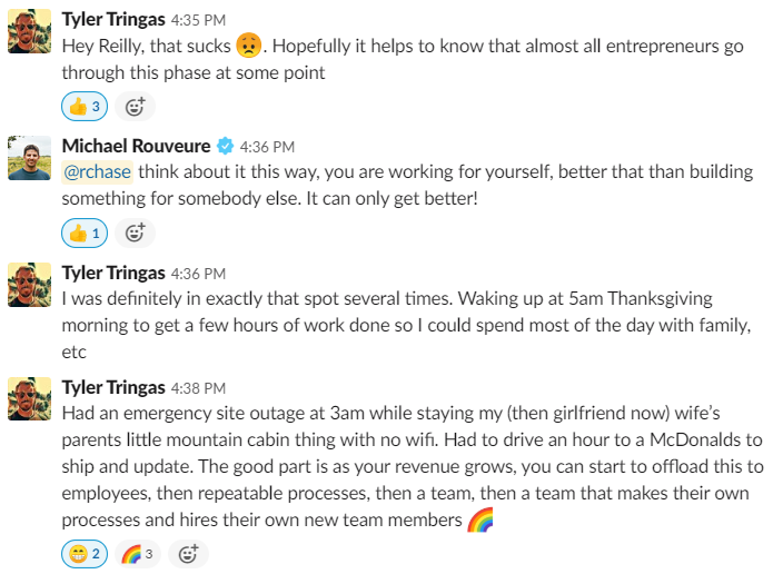 I came back from the camping trip with a sinking feeling of failure. I enjoyed my work but I had created a business that demands more of my time and pays less than my last job. I shared my frustration to the mentors and founders in our private Slack channel at Earnest Capital.