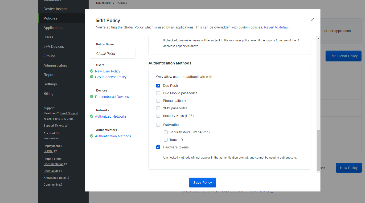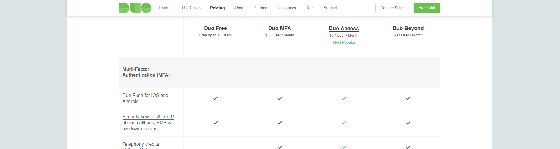 But I quickly upgraded to a paid plan when I realized the free plan does not allow you to create policies — for example, I wanted to enforce using the Duo app, and disable SMS as a 2FA option because it’s not secure. I upgraded to a paid plan which requires a minimum of 10 users at $30/month. No problem with the pricing though, this is a huge security benefit for us.