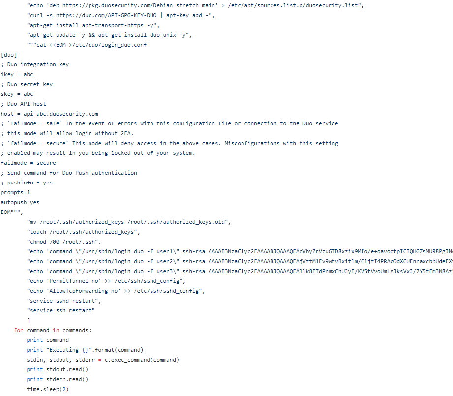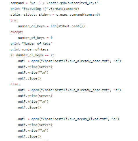 - It counts the number of SSH keys that already exist in /root/.ssh/authorized_keys to see if there are more than 2. If there are more than 2, it saves the server name to “duo_needs_fixed.txt” which we will later write another script to deal with. Basically, some customers currently have root access, and we are going to remove their root access now and instead give them a limited privilege user so they can still change Ubiquiti files but not server files.