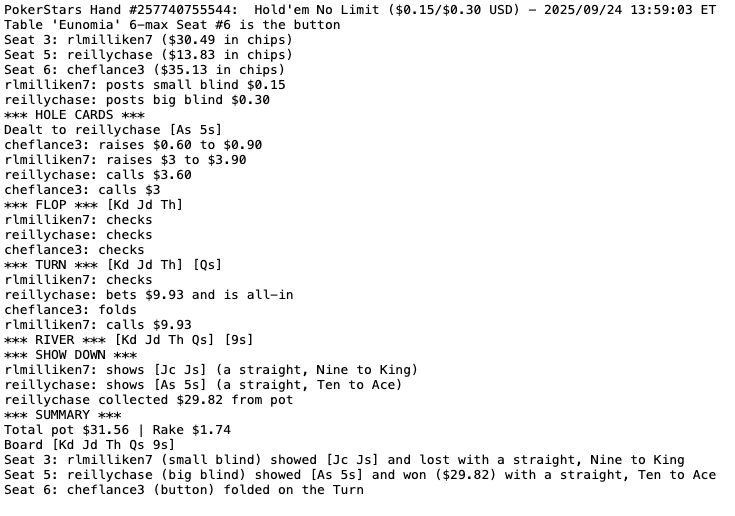 - Complicated (over 700 lines of code) poker hand history text file parser