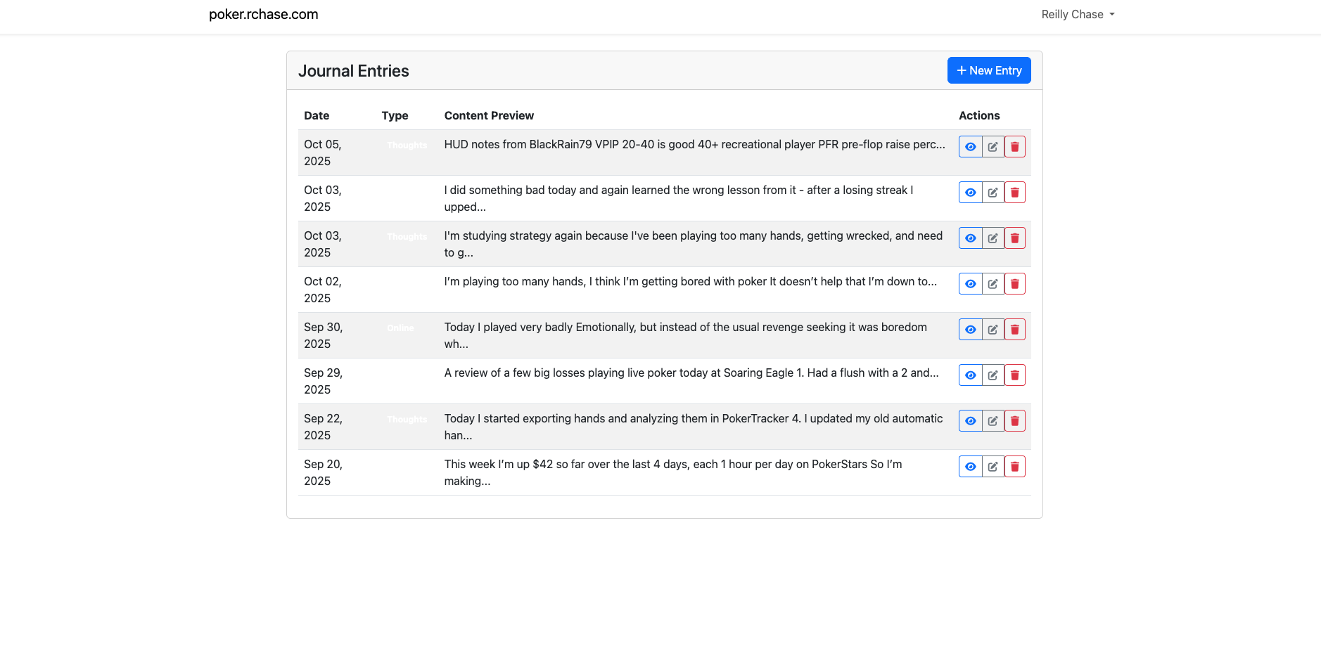 - CRUD for journal entries, logging poker account deposits/withdrawals