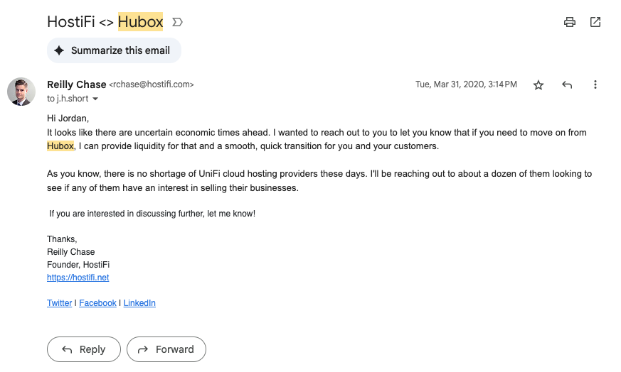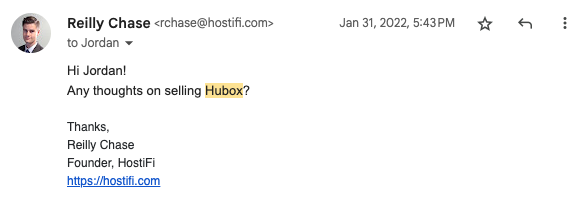 In March of 2020 lockdowns began and for some people the world was ending, for others it felt like it was. For me I was busy emailing each of my competitors to see if they'd be scared into selling. I wrote the founder of Hubox this email.