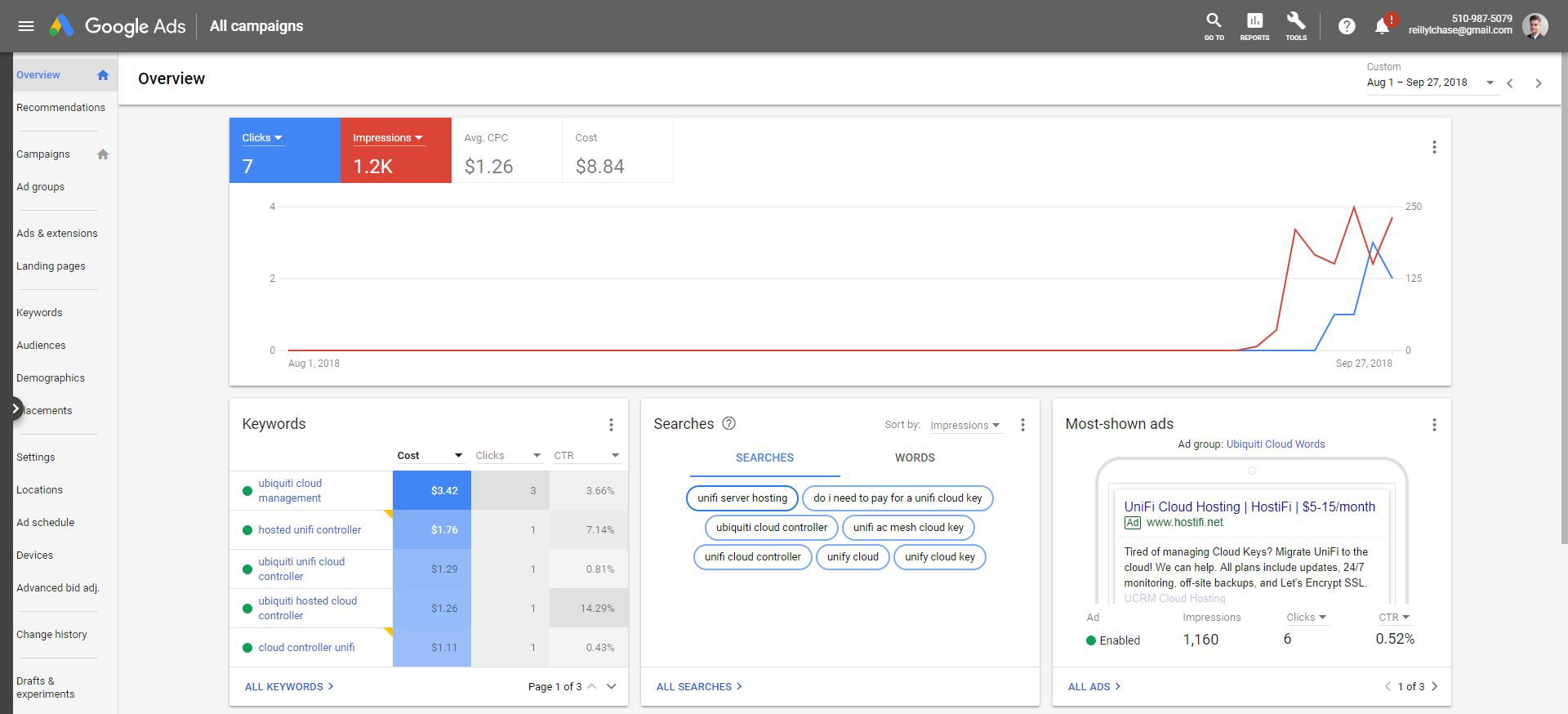 This has been an advertising strategy that has been working really well for HostiFi. When people search for various combinations of “UniFi cloud hosting” we come up in an ad at the top of the search results. Still need to implement conversion tracking for this, but several people have already told me that they found us through the Google Ad, and at around $1.10/click for a ready-to-buy type of search term, I plan to keep paying for these.