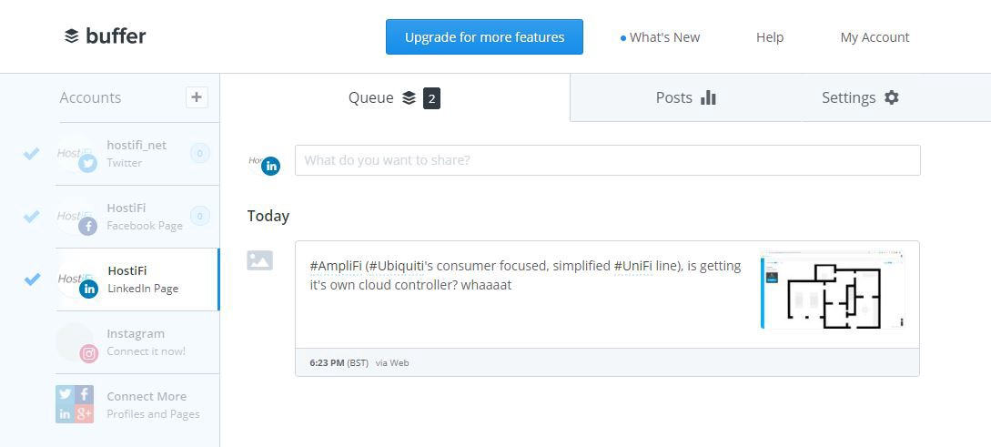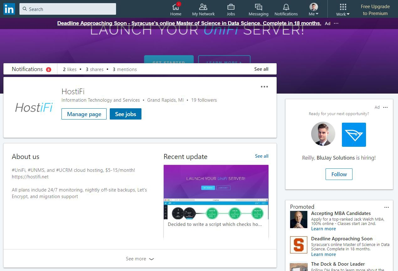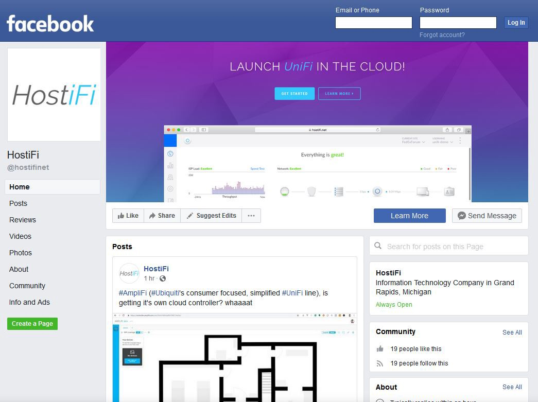 One of the first social media platforms I made a HostiFi page for was on LinkedIn. I knew it would be a good place to start for a B2B company. However, it has been a very difficult platform to work with. The problem is that interaction is completely one-sided. Users can interact with companies, but companies can’t engage with or connect with users. That makes growth very difficult. To date, we only have 19 followers on our LinkedIn page. My guess is that they are mostly my friends and existing HostiFi customers.