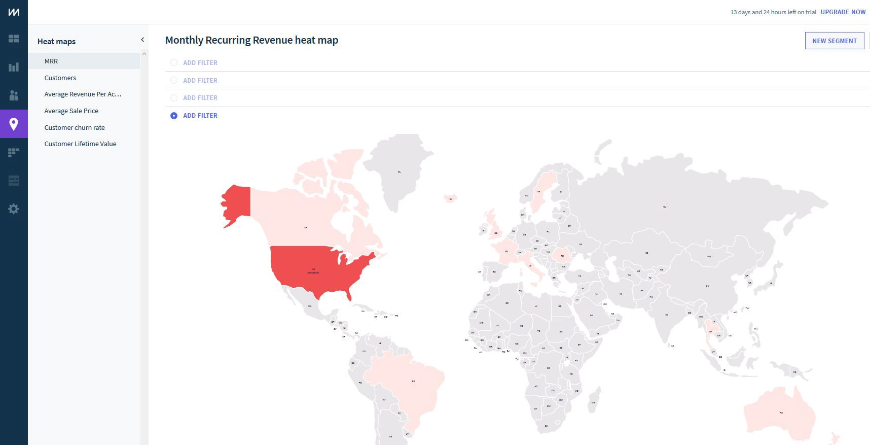 ChartMogul is one of my favorite tools on this list. It tracks and graphs all kinds of useful information based on your subscriptions, imported from Stripe transactions. It tracks metrics like MRR growth, churn rate, average revenue per account, customer lifetime value, average sale price, and more. Seeing the map of our customers above was really cool too. I actually had no idea how many customers we have outside of the US, because I didn’t have any way to track it before using ChartMogul. And the best part is that it’s free for startups that under $10k MRR!
