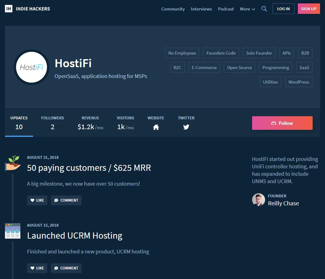 I created an Indie Hackers page for HostiFi. It’s not really a marketing platform, because SaaS founders aren’t our target customer. But it has been a great community to be a part of and learn in. I also feel that it provides a form of social proof to potential customers who might come across it because it ties in with Stripe and Google Analytics and posts charts of revenue and web traffic growth.