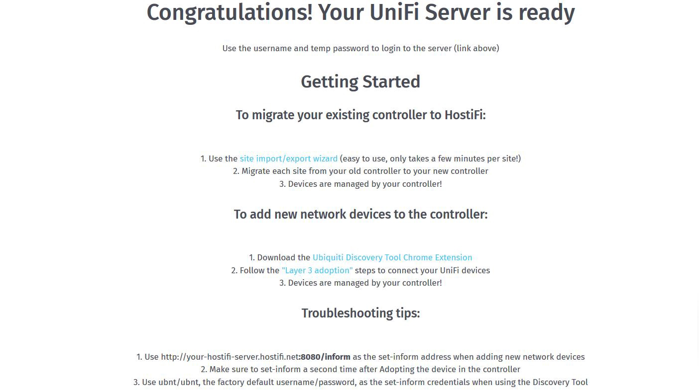 If you signed up for HostiFi on launch day, your UniFi controller would be created, and you would find the URL and credentials to UniFi in your dashboard.