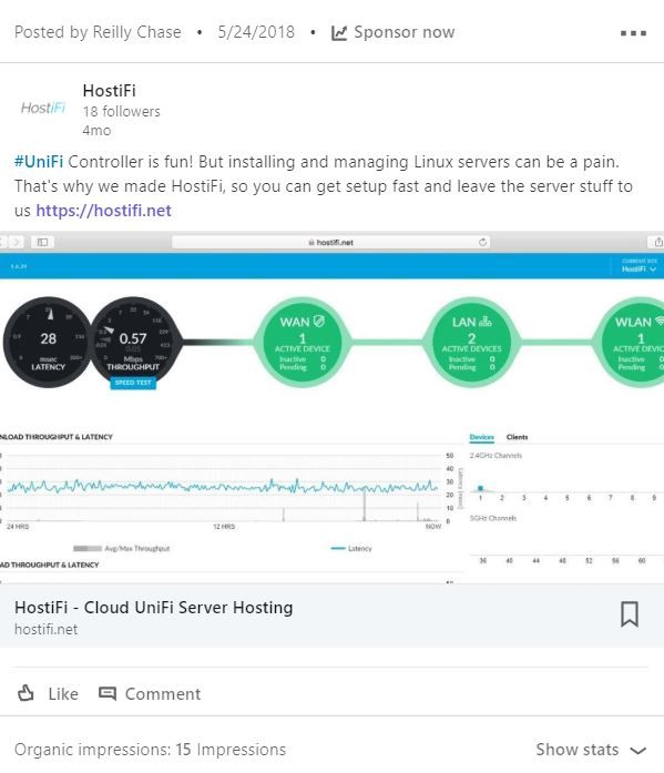 Didn't work. See where it says 15 impressions? That’s how many people might have looked at that post. Not on that day. That’s 15 impressions total for May through October. Using LinkedIn to find Ubiquiti users wasn’t going to work. Although LinkedIn has hashtags and groups where Ubiquiti users can be found, company pages can’t engage with other people’s posts. A company page also can’t “connect” with anyone. It’s a one way street where users can interact with a company, but a company can’t interact with users.