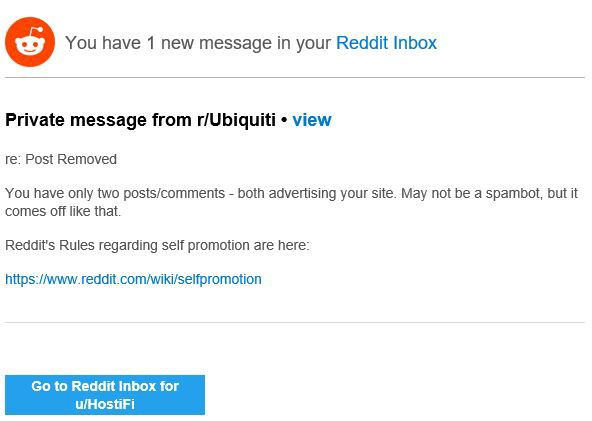 Didn't work. This one still really, really bums me out. The Ubiquiti SubReddit has an incredible 22.4k subscribers, certainly one of the biggest congregation of Ubiquiti users on the internet. On May 25 (day after launch), I created an account for HostiFi and sheepishly asked “What do you guys think of https://hostifi.net?" Almost immediately my post was deleted and I was reprimanded by the mods. I argued that the content I posted wasn’t spammy and was useful to the community, but they weren’t buying it.