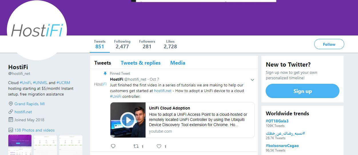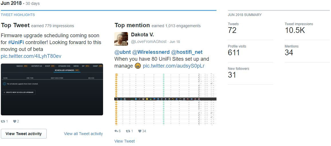 Success! I created a Twitter account for HostiFi pre-launch, on May 16, 2018. I spent that month following #Ubiquiti and #UniFi. I mainly retweeted, liked, and followed users who were posting there.