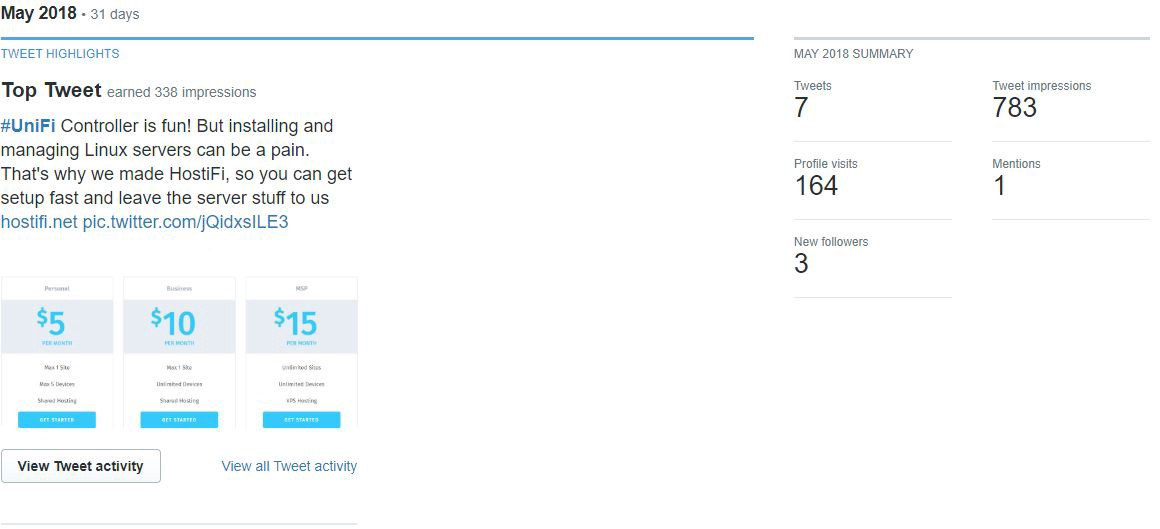 Above is a screenshot of HostiFi’s Twitter Analytics in May 2018.