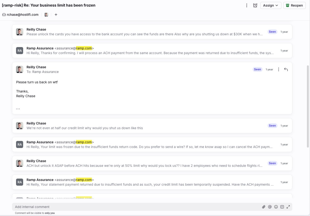 I had two employees who need to book flights and are unable to, all the payments for my SaaS and critical infrastructure for my business were beginning to bounce, and even my email client was threatening it was going to cut me off if I didn't pay as I hastily typed an email to the Ramp support team: