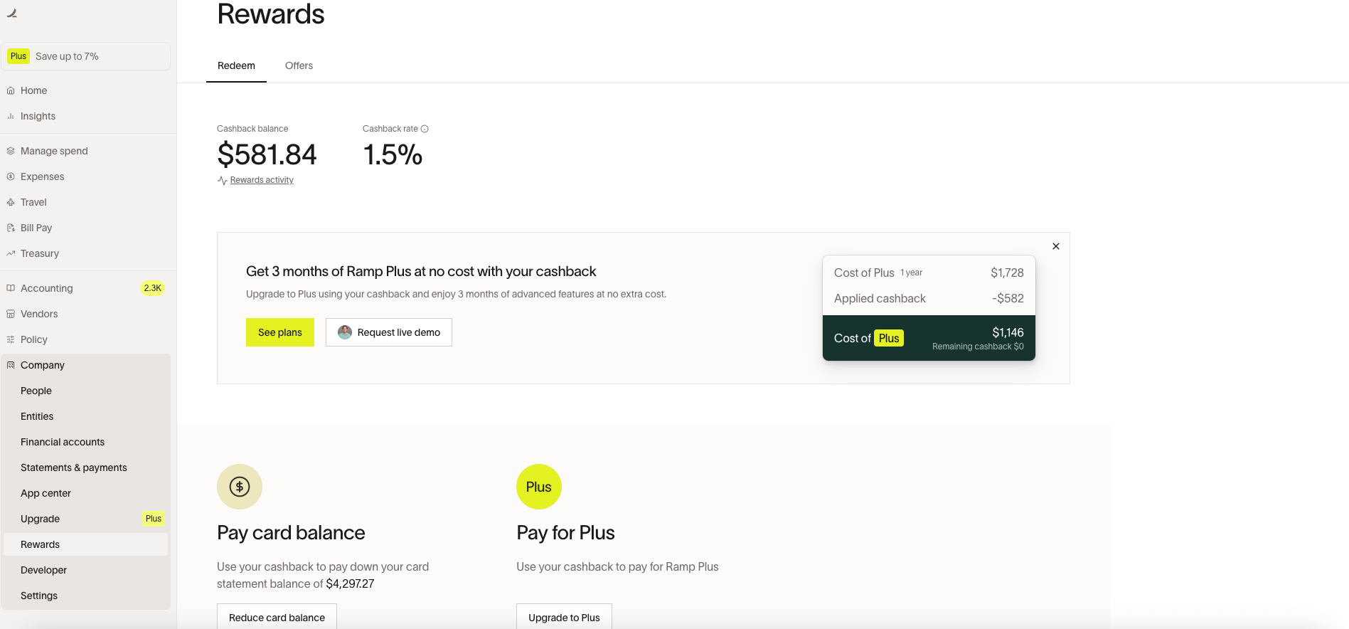 So I'm getting about 40-50% less cash back doing it Ramp's statement balance credit way than I would get at Big Bank by withdrawing cash back into personal checking.